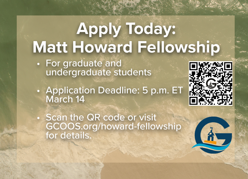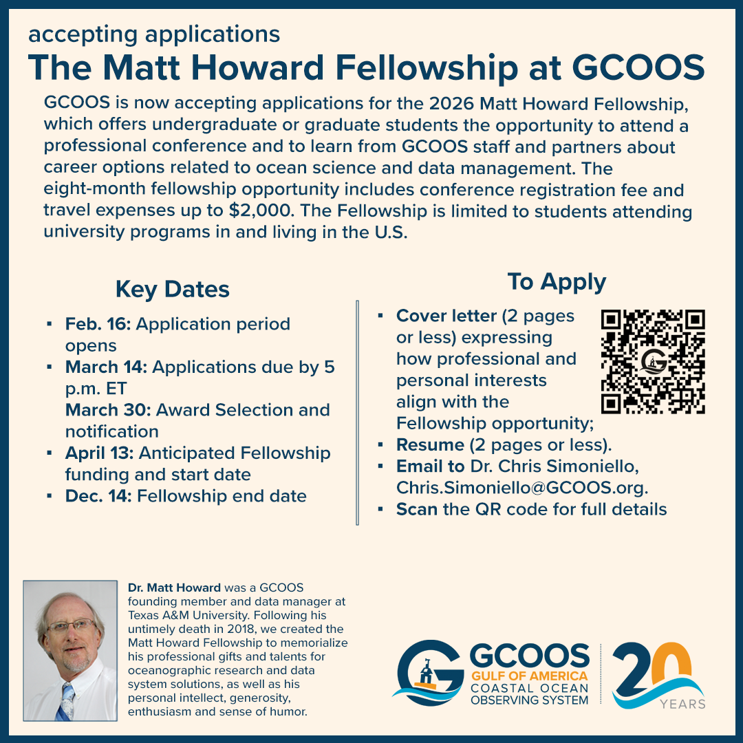 GCOOS is now accepting applications for the 2026 Matt Howard Fellowship, which offers college students (undergraduate or graduate) the opportunity to attend a professional conference and to learn from GCOOS staff and partners about career options related to ocean science and data management.