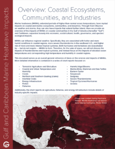 Gulf and Caribbean region. It includes a broad overview of expected impacts from marine heatwaves, along with a series of short reports focused on impacts to individual species — like oysters and finfish — and economic sectors — like energy and fisheries.